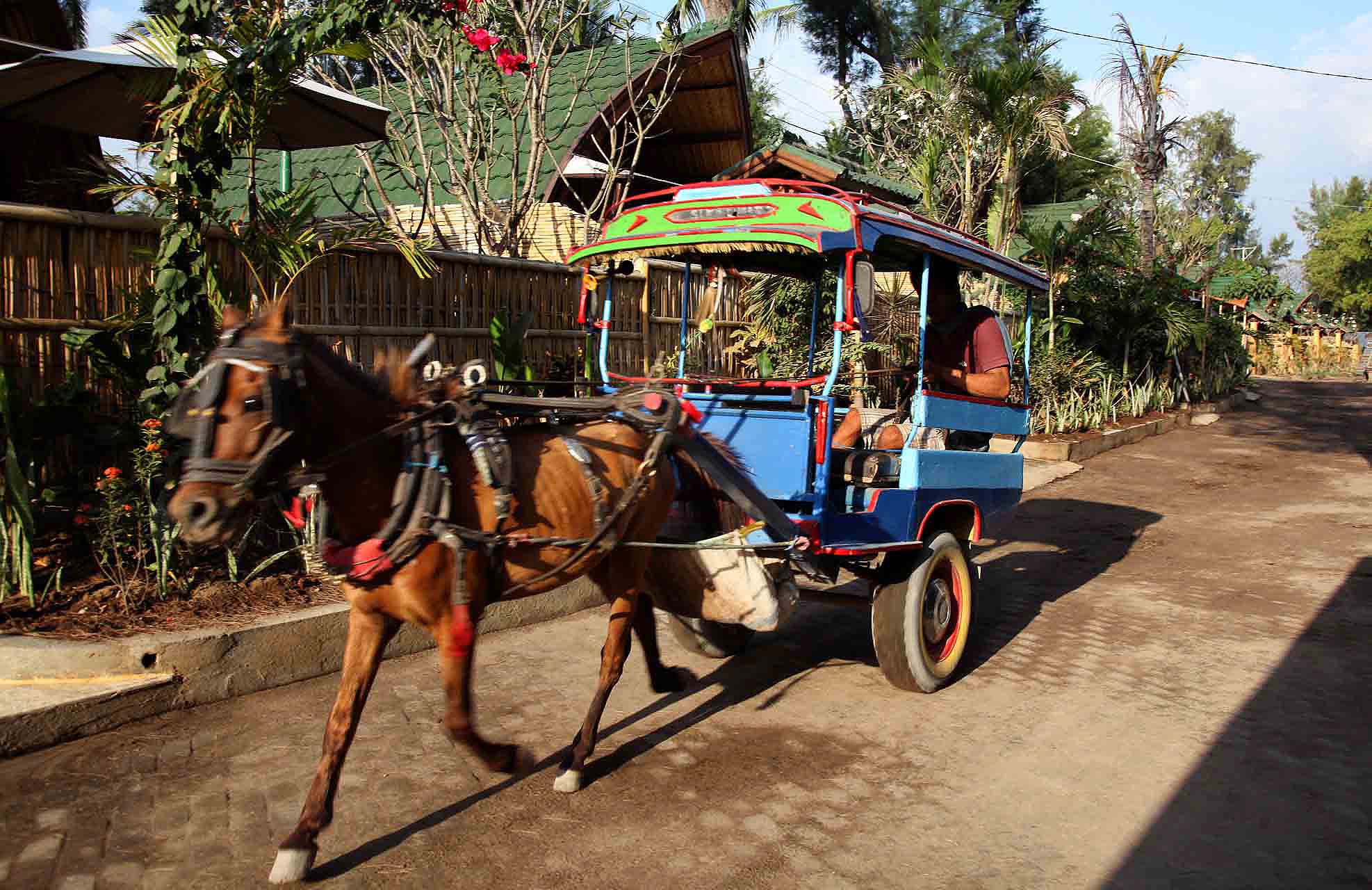 Much more pleasing on the eye and the ear were the cidomos, or tiny horse-drawn carriages that are still used in Lombok. They – and bemos and motor bikes and taxis and buses – are the main forms of transport on the roads, but are not at all popular with motorists or bus drivers as coastal roads are narrow and winding. A slowly elegantly trotting pony tugging a ribboned and tasselled carriage full of old women holds up traffic more than a little. At night, some of these carriages actually had candle-lit sidelights: picturesque certainly … but accidents waiting to happen as the delayed hurtling hulking omnipresent Pariwisata buses nip at their heels waiting for a few centimetre of open road to pull out and flash past.