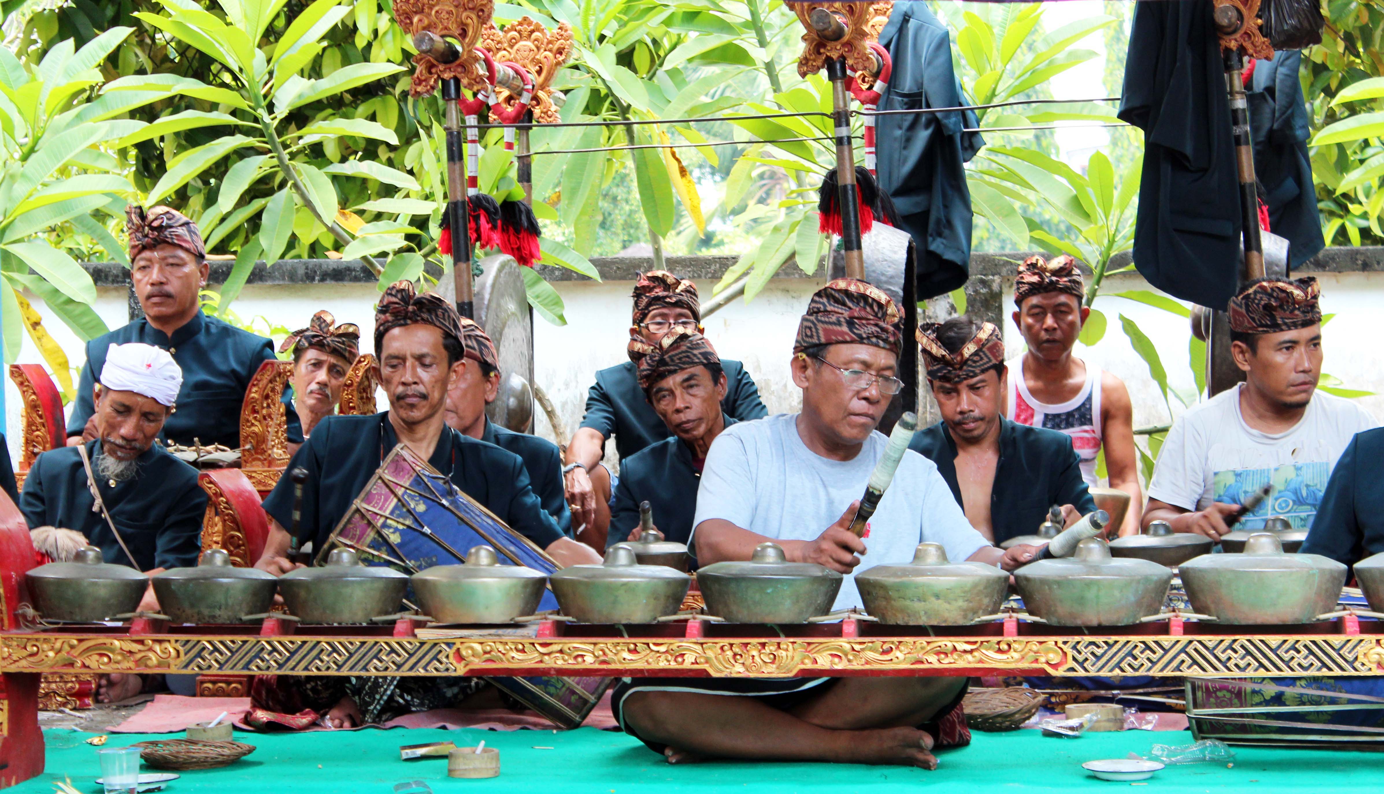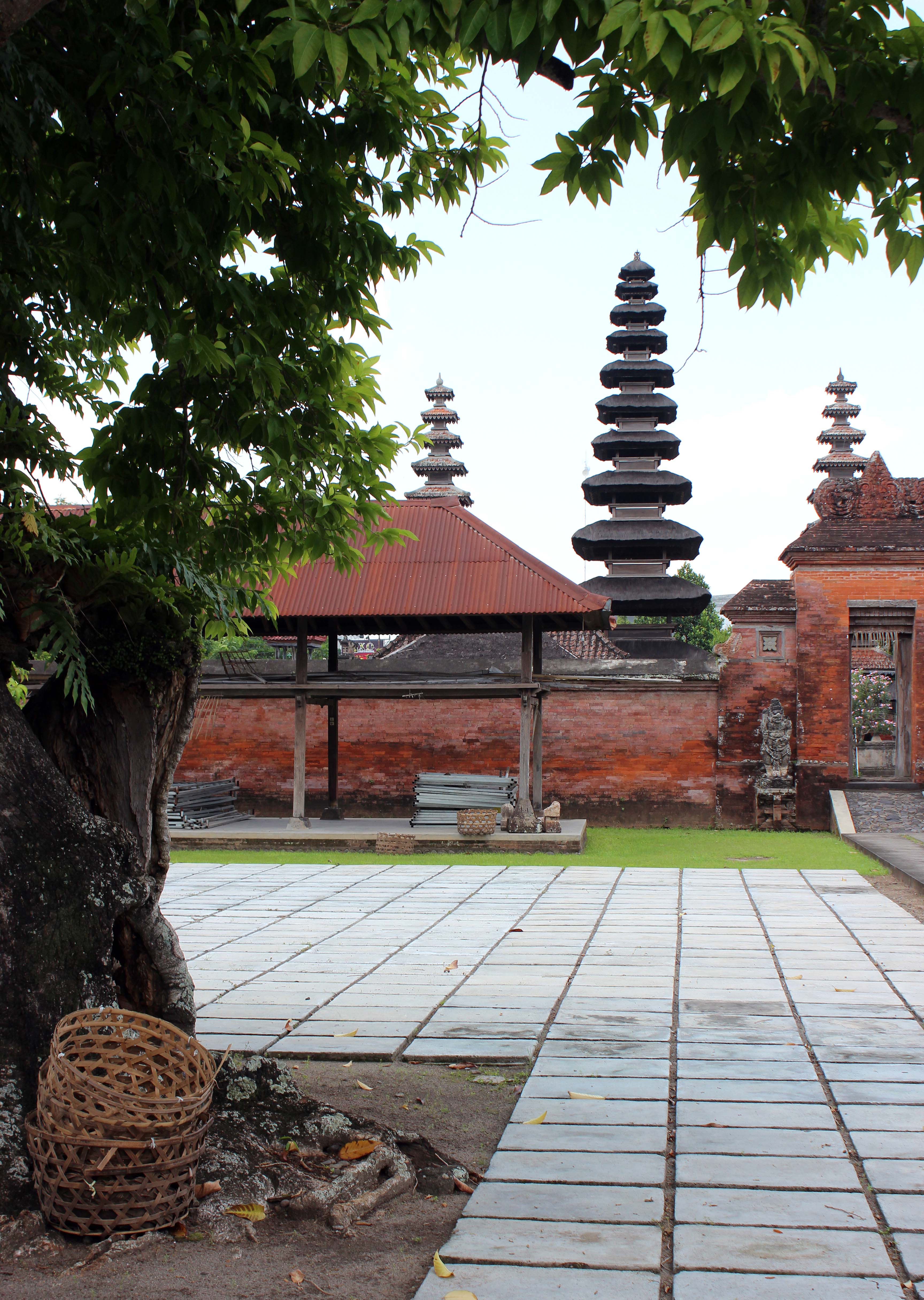 The once-famous Mayura Water Palace is just a short toss of a dead dog away from Pura Meru, and is now just a smallish lake with a central pavilion connected to the mainland by a short causeway. Nearby a gamelan orchestra was practising for an unknown event on the calendar, and one of the shrines in the inner courtyard was gaily decorated with swags of gold and black fabric.