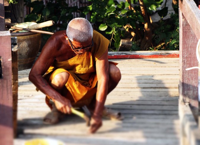 Over the bridge I chatted to an elderly monk from Wat Kudithong who was repairing the old timber bridge. On this very rare occasion I think I had more Thai language than he had English language, and judging by the number of nails he bent as he hammered the old timbers I think he would perhaps benefit more from woodwork lessons than from English lessons.
