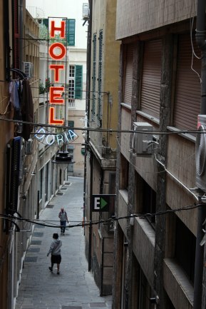 The Trattoria dell Acciughetta (http://www.acciughetta.it/) is a goodly walk from all the palazzi, past the cavernous side streets lit with neon hotel and restaurant signs, but only five minutes from Central Station (OK: La Stazione Ferroviaria di Genova Principe – how these Italians DO go on!) and about the same distance from my hotel. I ate there a couple of times and immensely enjoyed the food and the wine and the passing caravanserai.