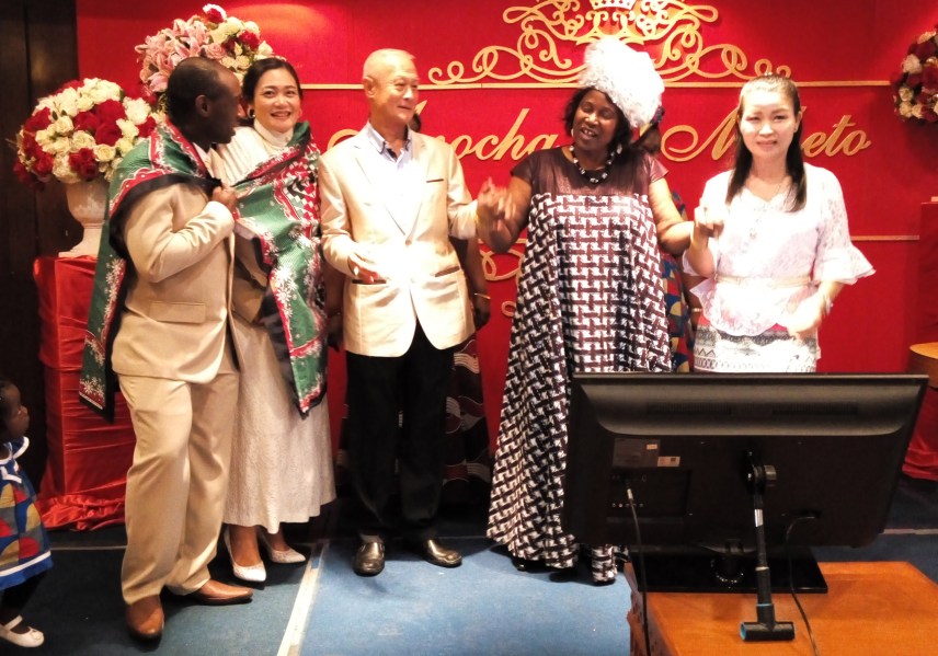 The guards (young men who were Anocha’s cousins) reluctantly lowered their barriers (strips of gold and red ribbons), gleefully pocketed the traditional red envelopes with which Chinese people “pay” their ancestors or present gifts to the family, and Mtheto was allowed in to the beautifully decorated wedding hall.