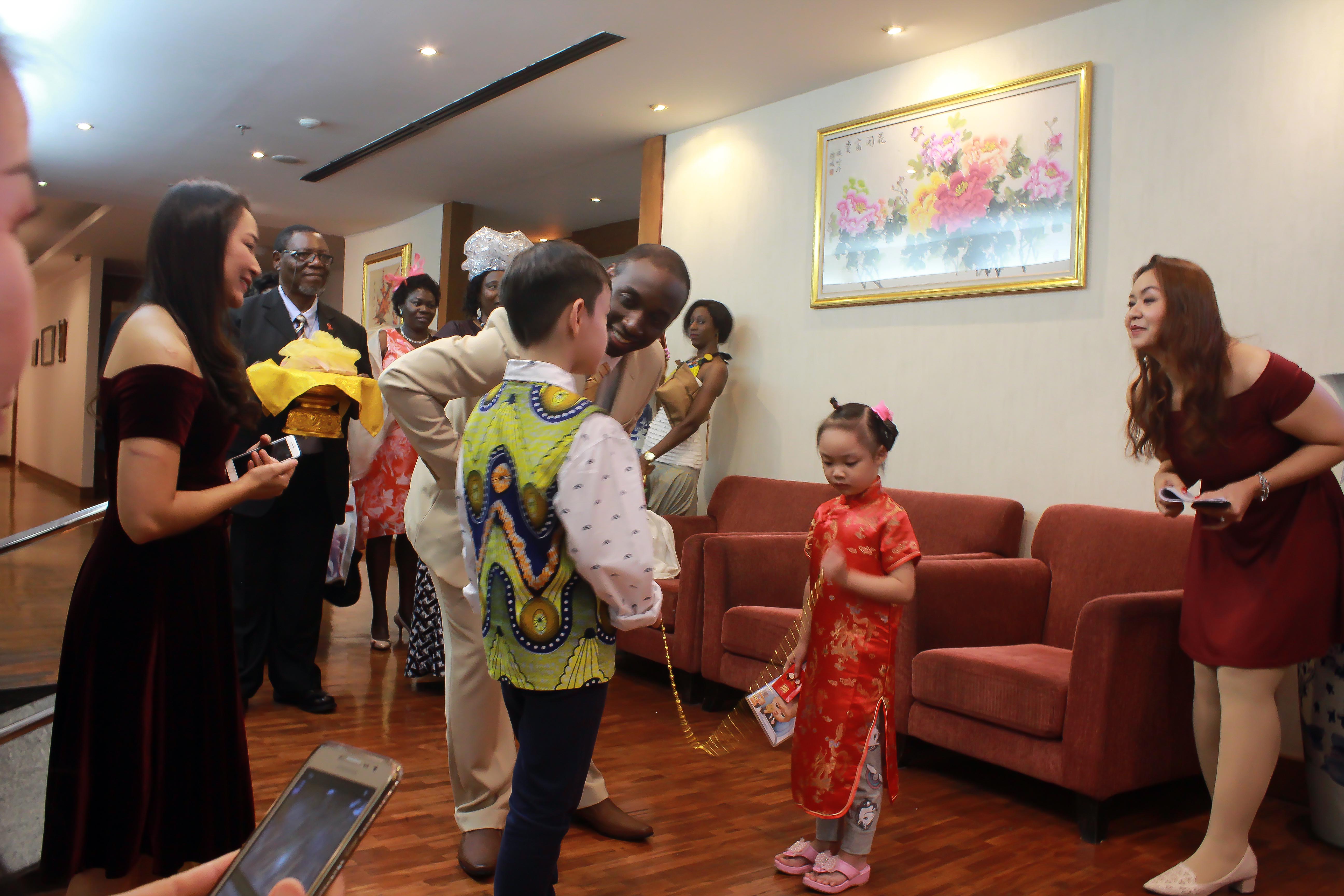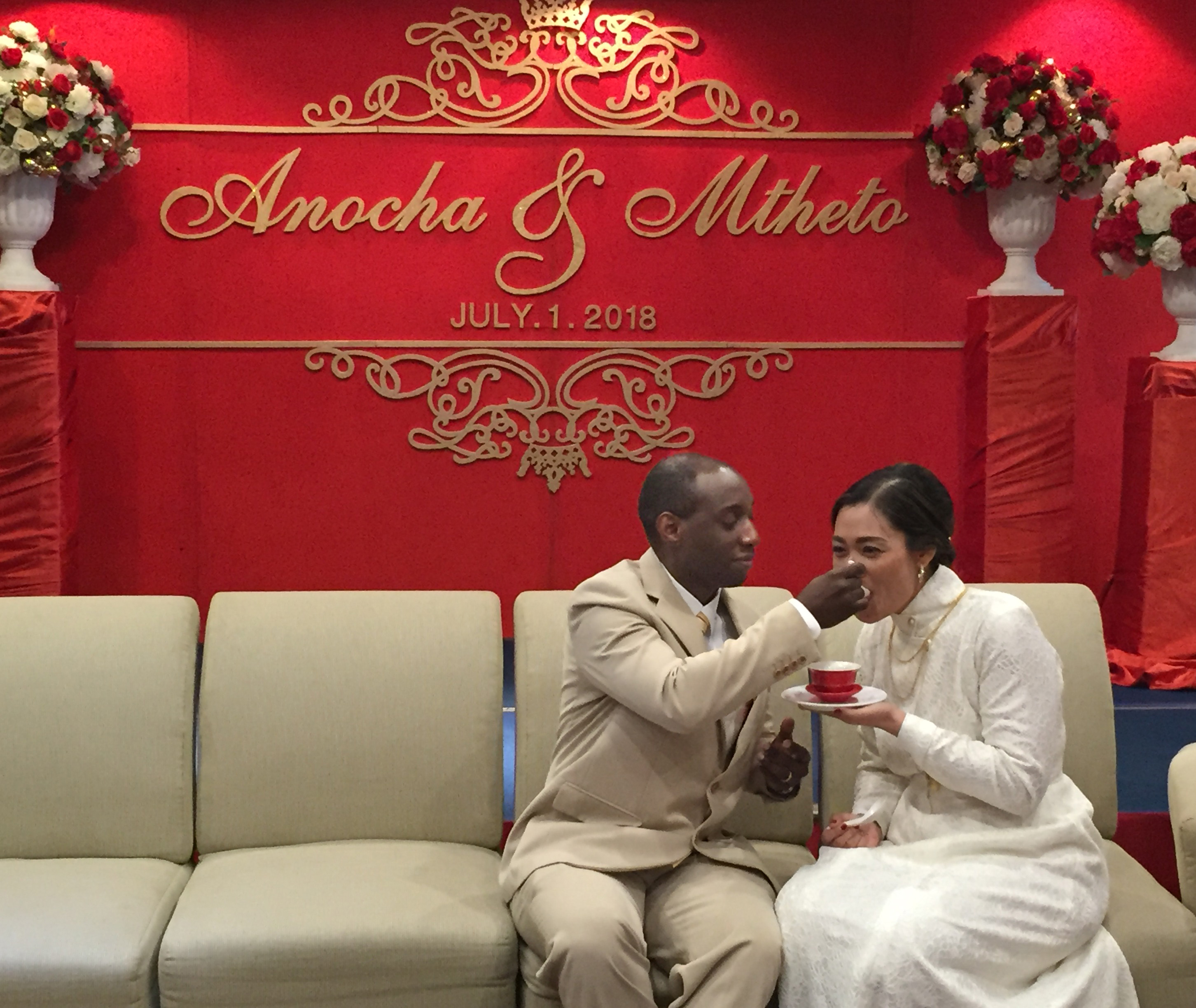 The guards (young men who were Anocha’s cousins) reluctantly lowered their barriers (strips of gold and red ribbons), gleefully pocketed the traditional red envelopes with which Chinese people “pay” their ancestors or present gifts to the family, and Mtheto was allowed in to the beautifully decorated wedding hall.
