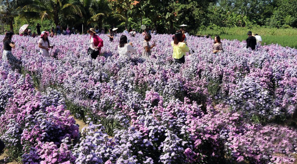 At this time of the year masses of white and mauve cutter flowers are in full bloom on the eight-rai (1.25 hectares) farm. I am not really sure what “cutter flowers” are and cannot find any authoritative dictionary meaning – but they are tall clusters of daisy-like blossoms that attract bees and selfies.