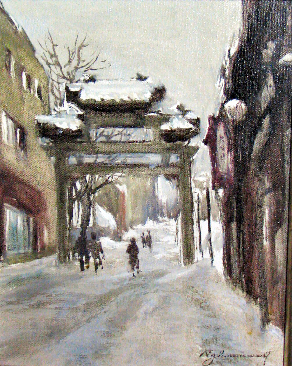 On that earlier visit I bought a small oil by him showing one of the gates to China Town covered in snow, and was delighted to see the same gate twenty or so years later – without its snow cap.