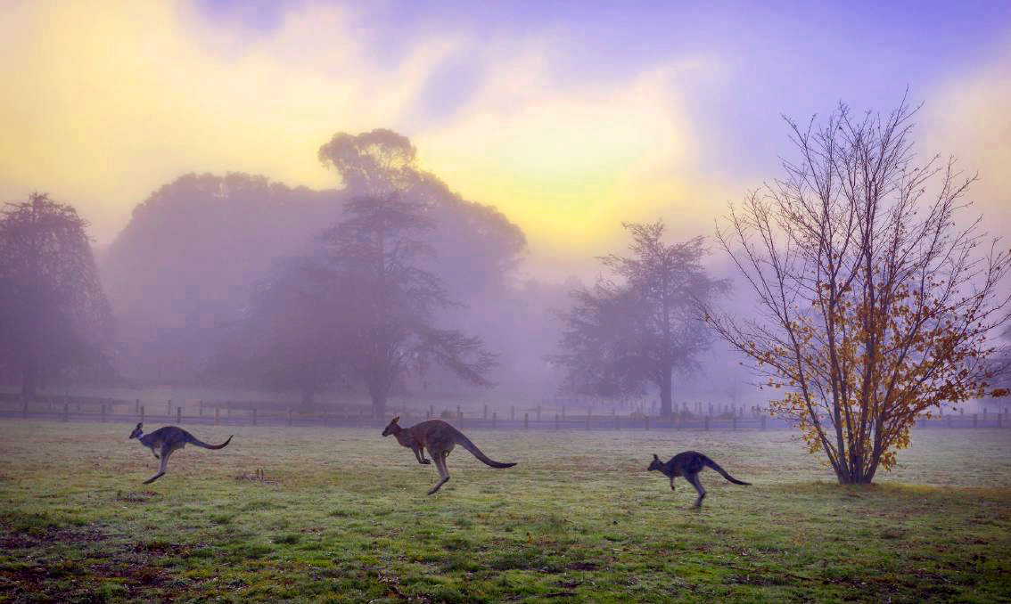 The tour wound through green and damp countryside, with occasional glimpses of alpacas or kangaroos.  At one stage a mob of ‘roos slowly bounded across a paddock by the road, appearing and disappearing in the softly swirling mists and rain,  and poking their way through slowly drifting aromatic clouds of smoke from gum tree stumps being burned by local farmers.