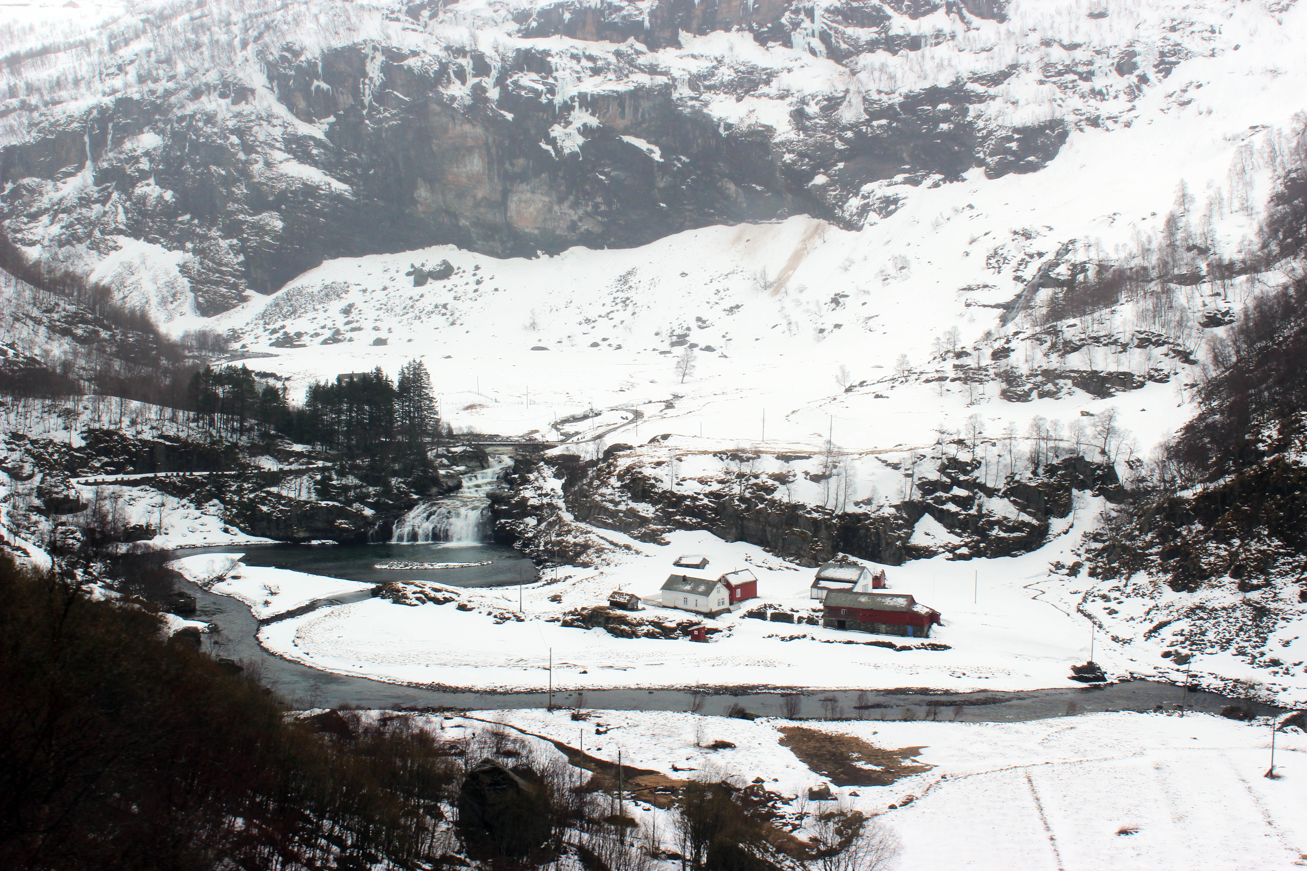 Norway’s Flåm Railway is an engineering delight as it winds and twists and goes through hair-pin tunnels from Flåm at sea level up to Myrdal at 866 metres above sea level in only twenty kilometres or so.  Arriving at the starting point, however, involved a train ride from Bergen to Voss, a bus ride from there to Gudvangen through ever-deeper snow and ice, and a two-hour cruise through icy fjords, with seagulls looping overhead and porpoises gallooping after the ferry.