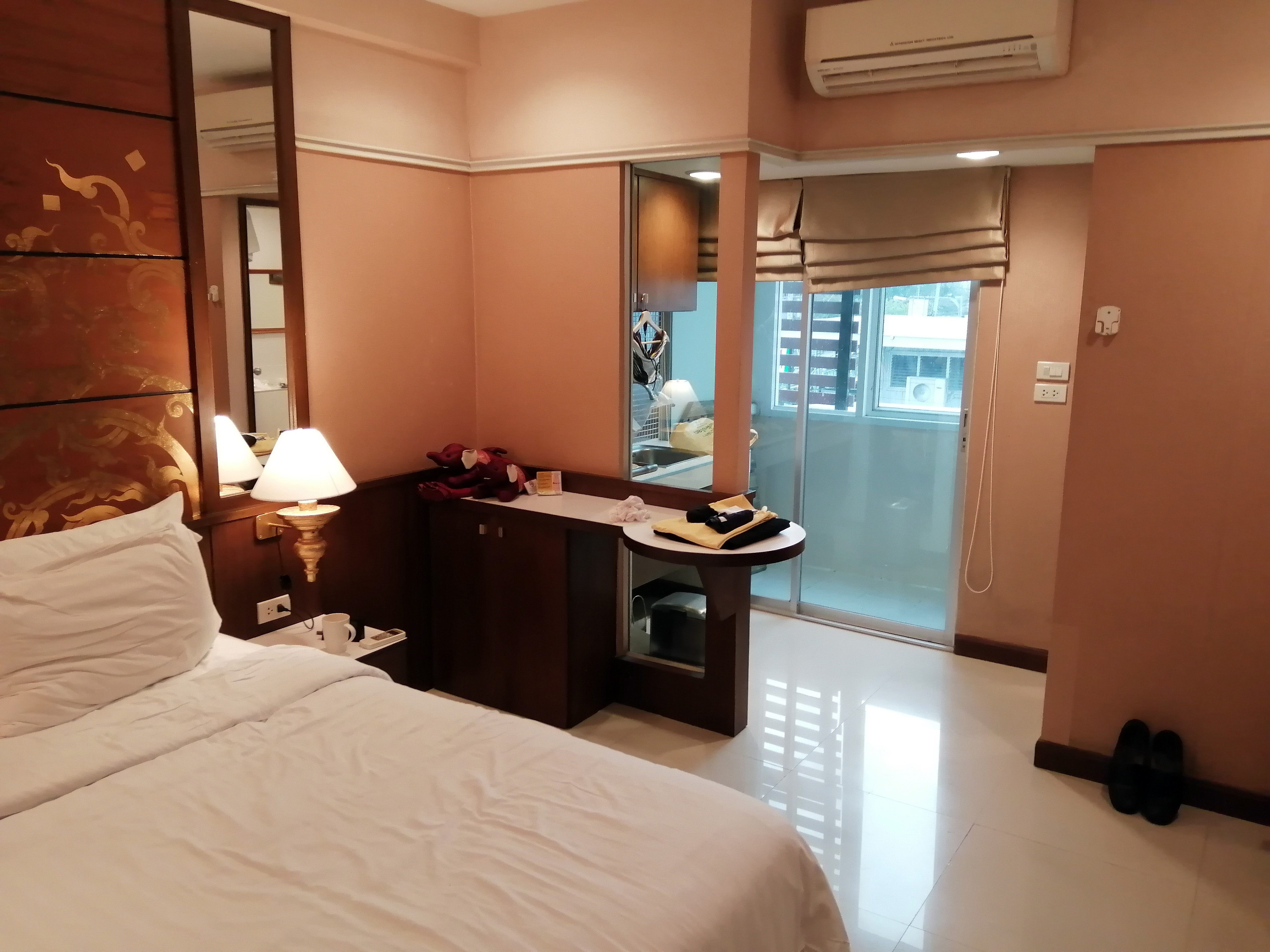 The room (I was in 308) was spacious, clean and comfortable.  It offered a good double bed, a small kitchen (refrigerator, microwave, kettle, sink), a compact bathroom with a good shower and a naked lady, and a small balcony overlooking the rather scenic rubble of the next-door building site.  Thai artworks featured on walls, and the work desk and room lighting were good.  Really – apart from the US$5.00 taxi fare from the airport and the lack of a swimming pool – the hotel represented superb value and convenience.