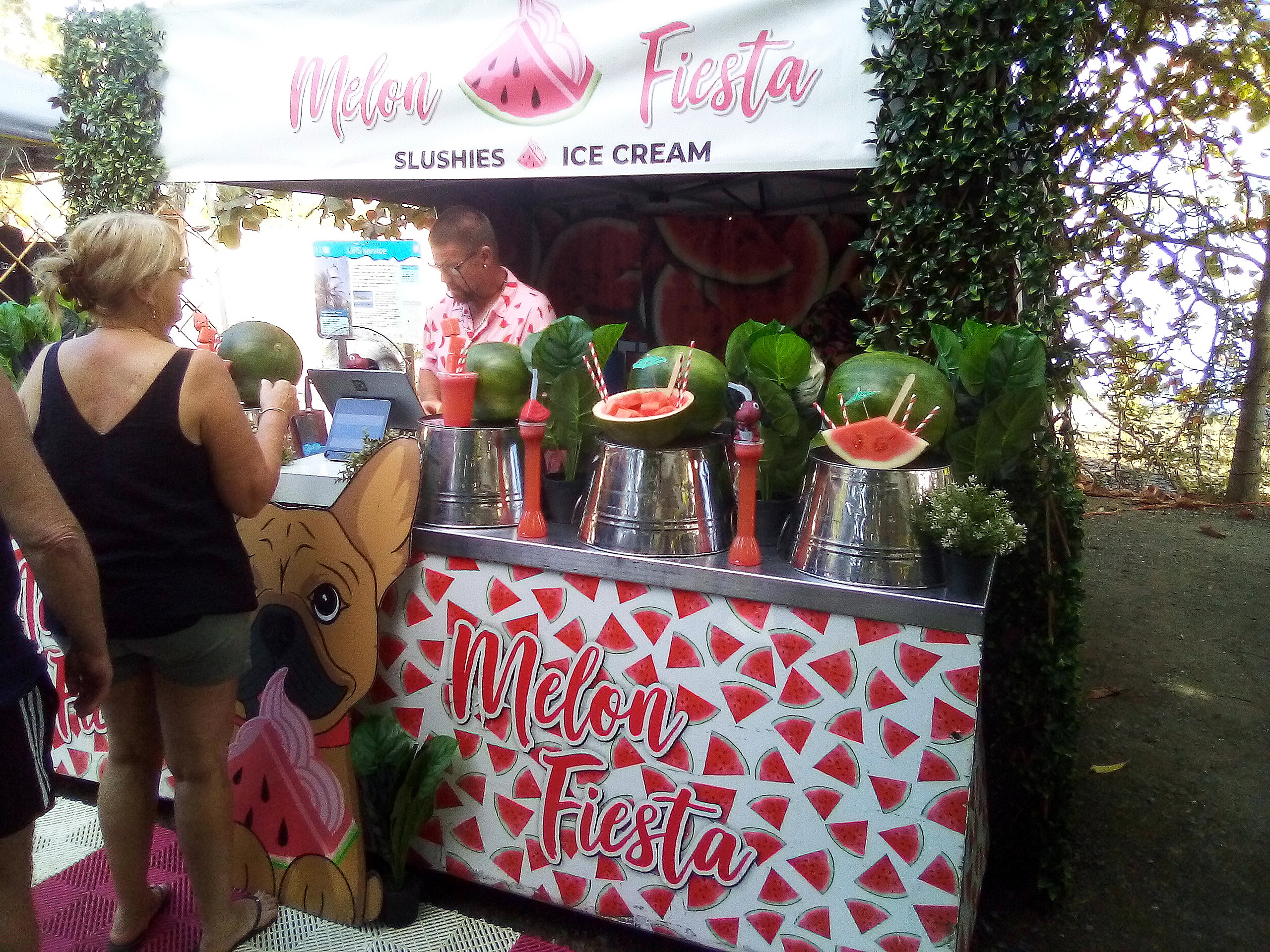 A path leads down from the hill back to the town and St Mary’s by the Sea and the fabulous Sunday Market where crystals are for sale along with fruit and recycled timber photo frames and hand-made beach wear (nothing over $39.00 …?), all sorts of foods, and drinking coconuts and all quite fun and family-friendly – although the doughnuts were very hot: