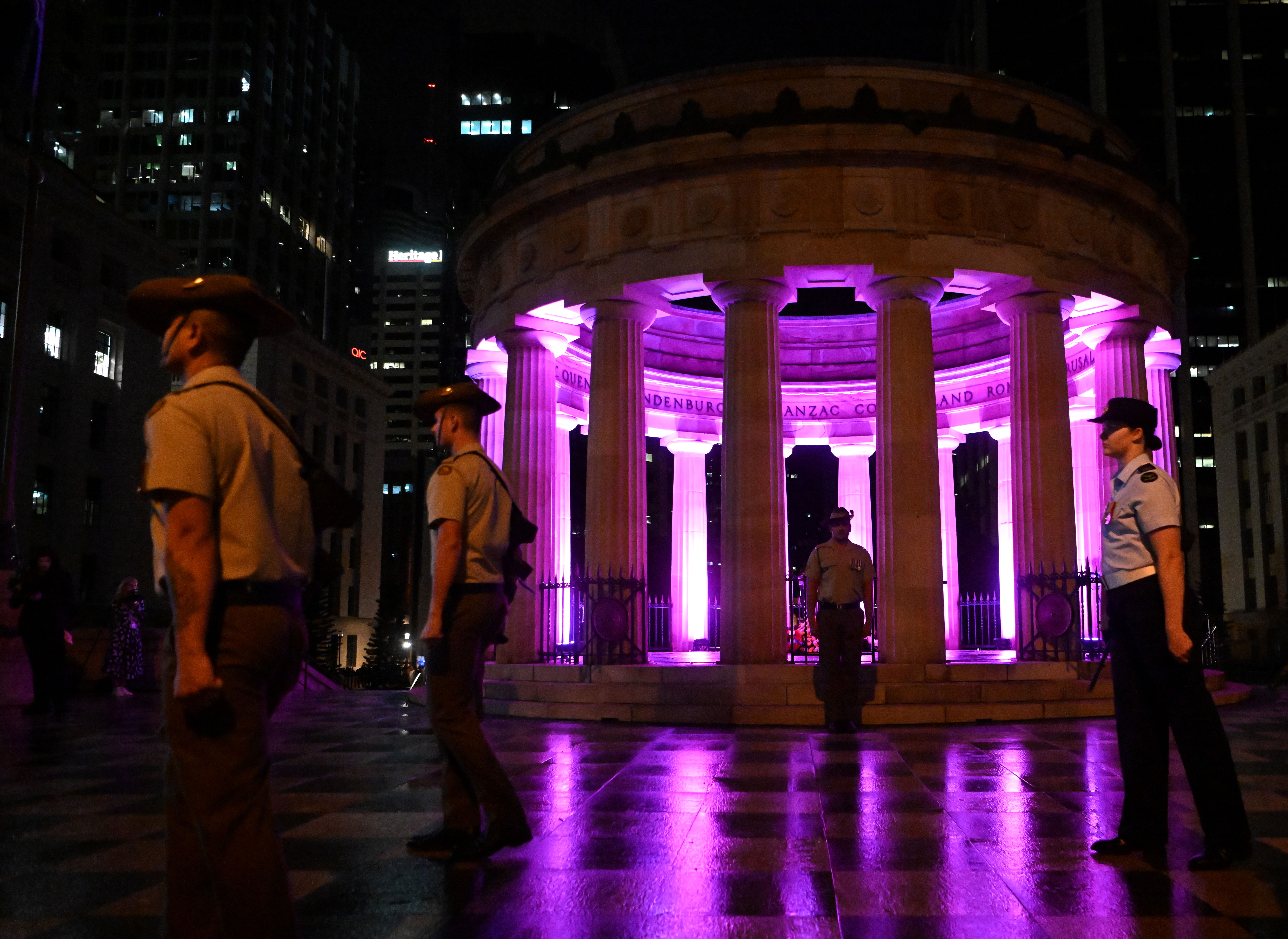 Brisbane’s Shrine of Remembrance is a striking monument in the centre of the city – with an elevated Greek Classic Revival structure and flights of stairs leading down to a park.  The huge Sofitel Hotel looms over the square, and at yesterday’s service some guests were early risers and could be seen silhouetted in their rooms, watching the laying of wreaths around the eternal flame in the centre of the shrine.