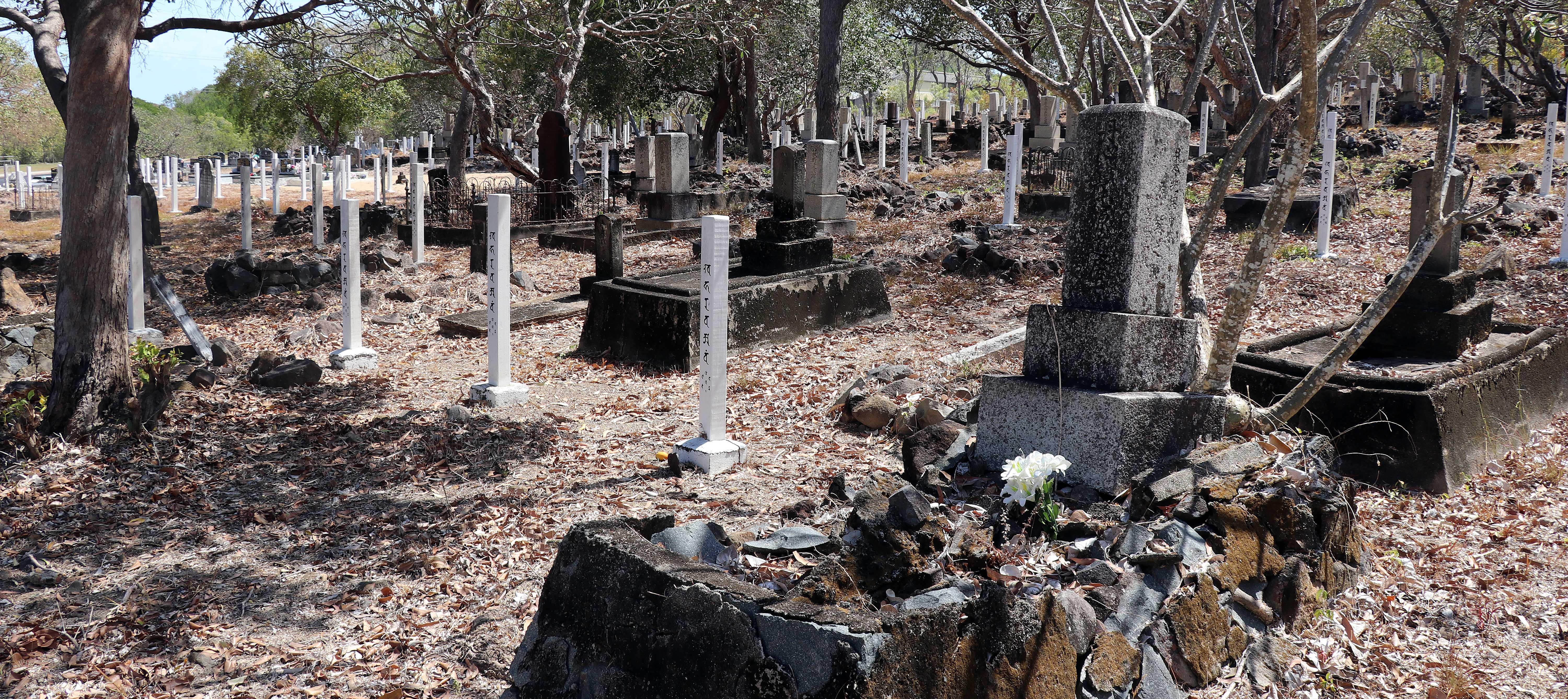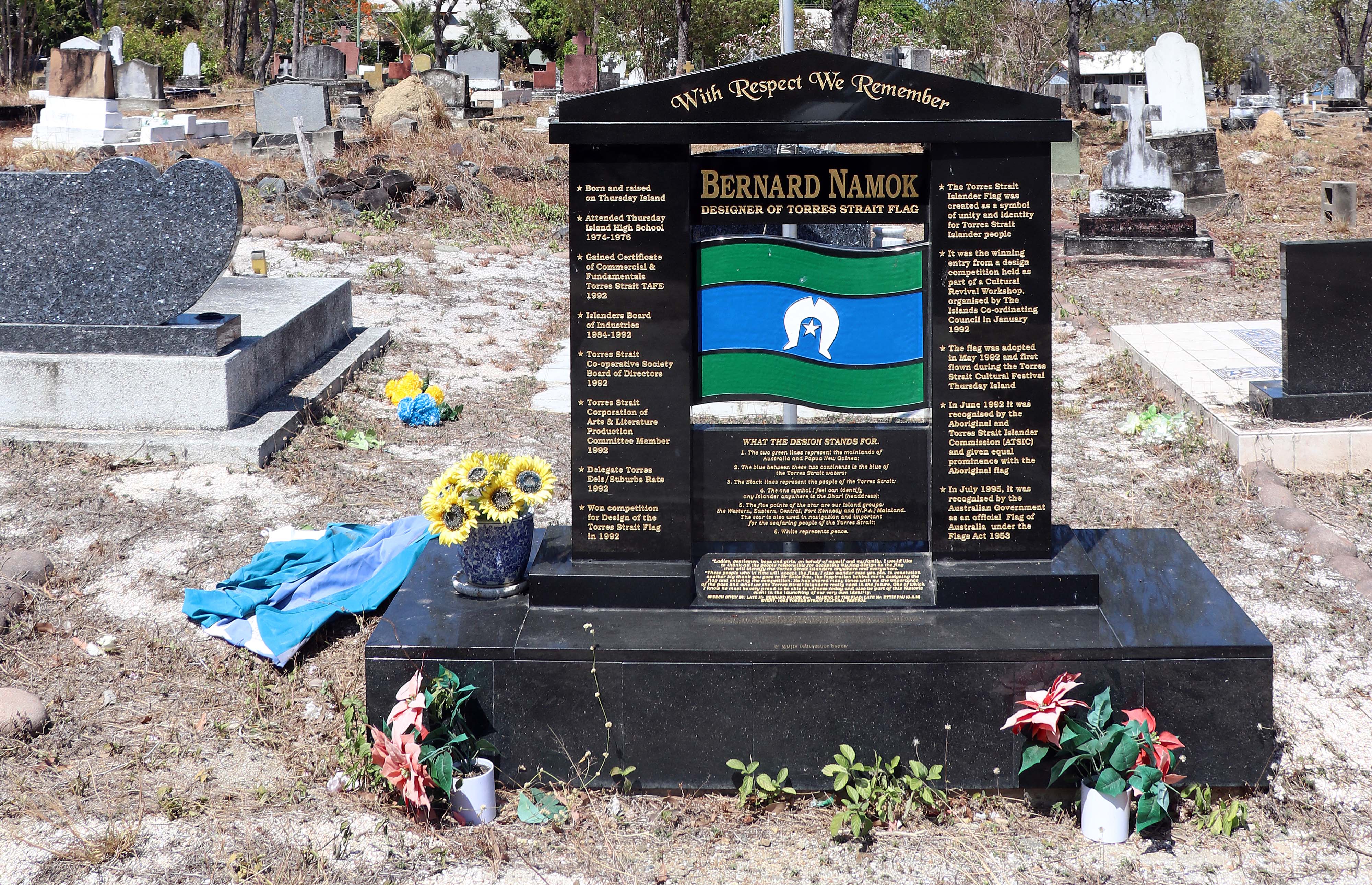 Adjacent to the Japanese Cemetery is the modern TI cemetery – with tombstones bearing the names of many families I knew … and the ornate tombstone for BM – a boy I did teach in the 1970s but who died in 2005. A nearby tombstone gives the details of Bernard Namok, who designed the flag recognised and adopted by the Australian government in 1992 as the official flag of the Torres Strait. This flag features the dhari or feathered headdress (see featured image, LEFT) worn on ceremonial occasions by men throughout the Strait, but particularly in the Eastern Island group.