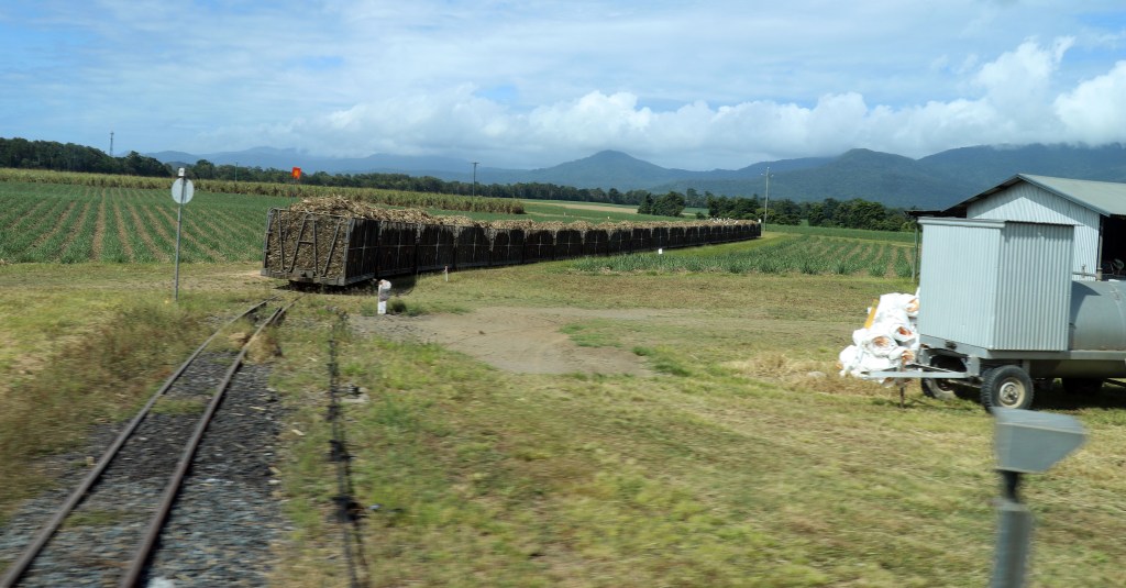 The RailBed cars offer complimentary meals and wines – all quite pleasant if not quite good enough to earn any Michelin stars – but probably good enough to earn a few Gordon Bloody Ramsey pithy epithets and cusses.  The beds are – for me – not quite long enough and not quite wide enough, but will probably give most people a very comfortable night’s sleep, peeping out the windows at the spectacular Glass House Mountains, the tiny cane trains carrying chopped sugar cane to the mills (see featured image LEFT) along the way, and the flocks of tiny birds accompanying assorted cattle as they graze on water flats along the way