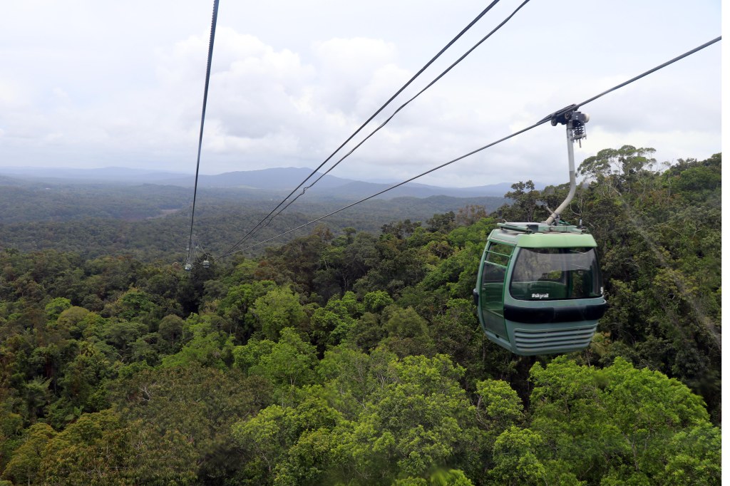 Imagine a gondola lugging enthusiastic skiers up the side of Mont Blanc, dropping them at the peak to schuss and traverse and jump their way down again.  Then imagine a gondola smoothly lifting explorers above pristine tropical rainforests, above trees festooned with the nests of migrating birds, passing striking waterfalls and swooping up and down over the Barron River until it reaches Kuranda about eight kilometres later:  this is Skyrail.