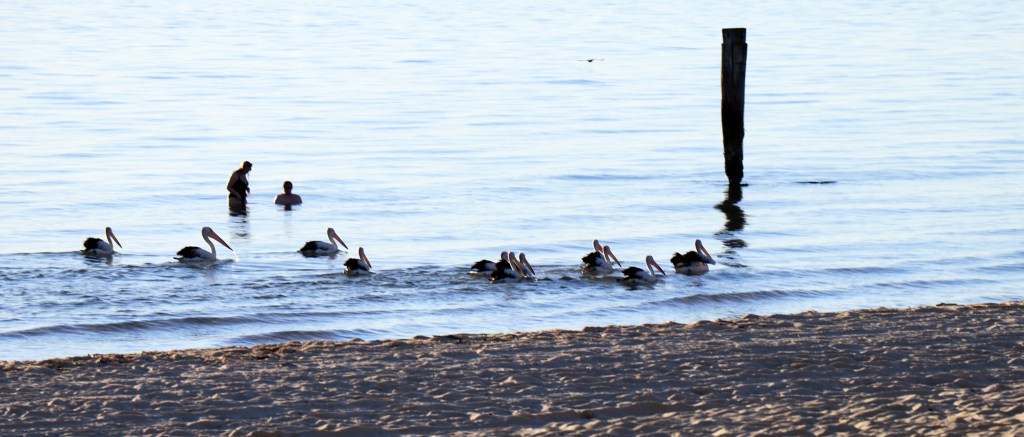 Visitors to this lovely island – now home to a comfortable resort and many private houses – can line up in the chilly waters at sunset to hand-feed the wild dolphins that visit every day.  This is a rather nice irony – humans feeding the fish instead of slaughtering them.  I don’t know if humans have trained the bottle nosed dolphins to come in for their fish suppers … or if the fish have trained us to be a dive-in fresh fish market.