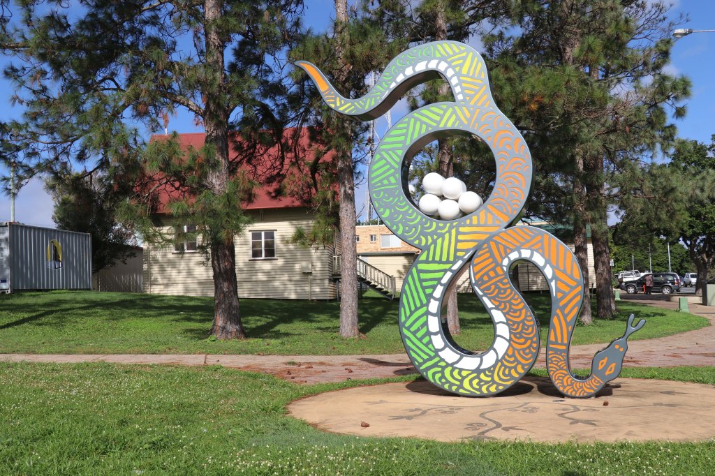 Another Place Marker and almost the first thing visitors to Minjerribah see is a striking stainless steel and ceramic sculpture of a snake nestling its eggs in a curve of its body.  Joshua Walker – artist and Quandamooka Songman – created the sculpture in 2022.  It represents Kabul or the carpet snake, the totem ancestor of the Quandamooka people.  Kabul is reputed to live in the depths of the Blue Lake.
