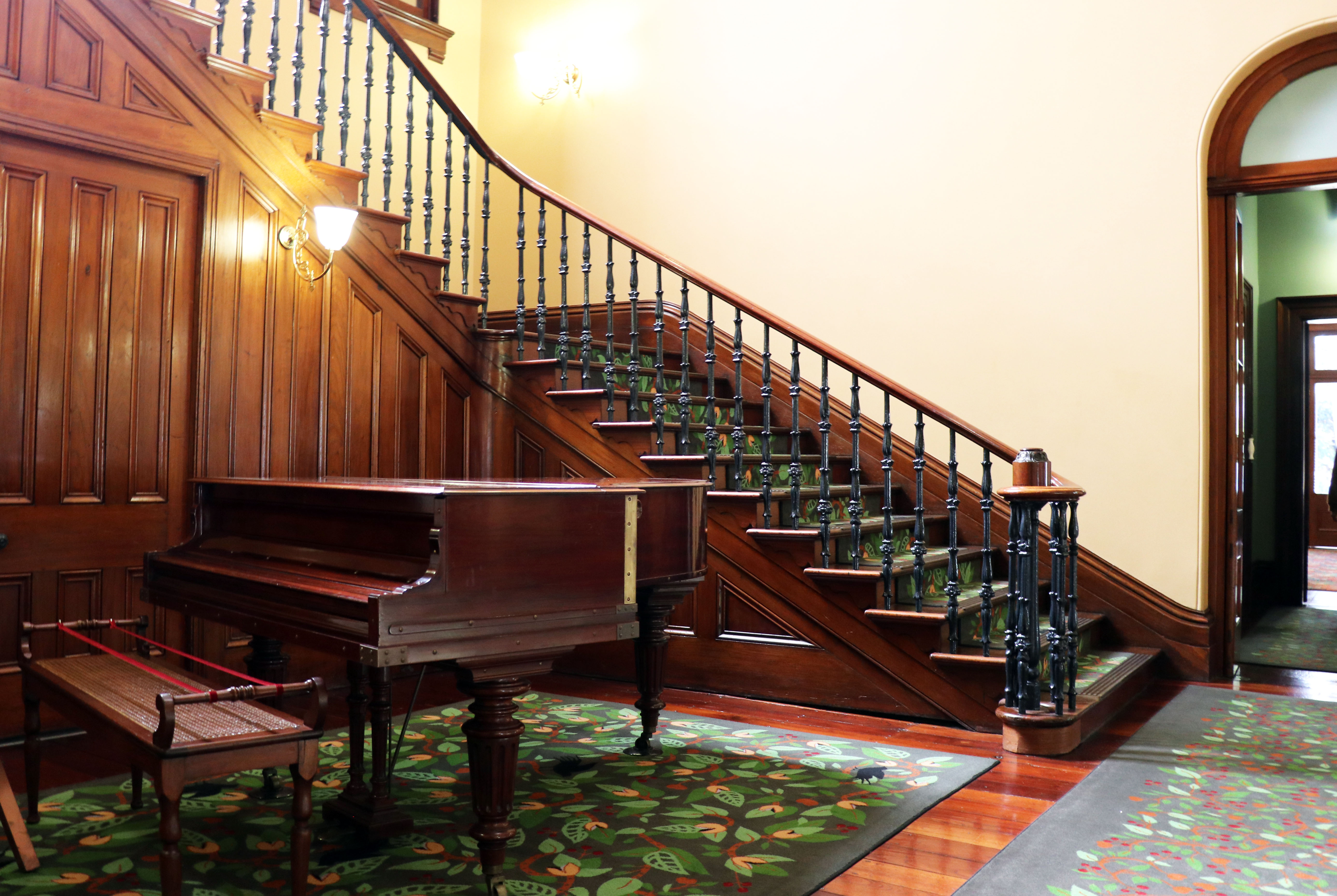The staircase handrail and the piano in the photograph above are originals but the strikingly modern carpet is a 2009 addition. I could not find out who made it or who designed it, but the design elements feature Australian flora and fauna – gum trees, lilly pilly flowers, grevillea seed pods and striking black crows – so it is nice that there is some Australian element in this building.